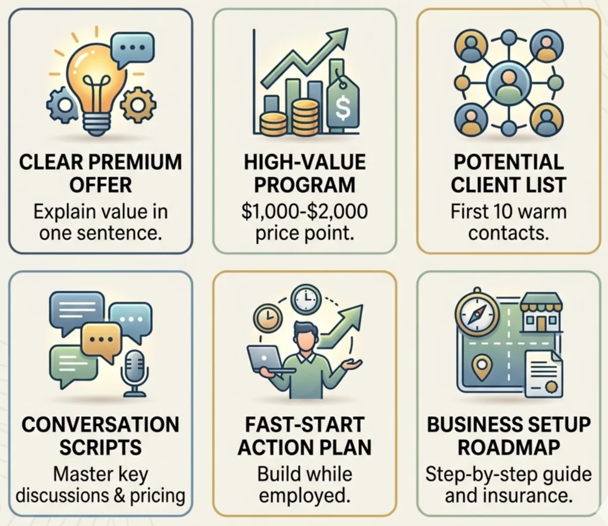 The core system: define your service, price your program, find your first clients, and know exactly what to say.