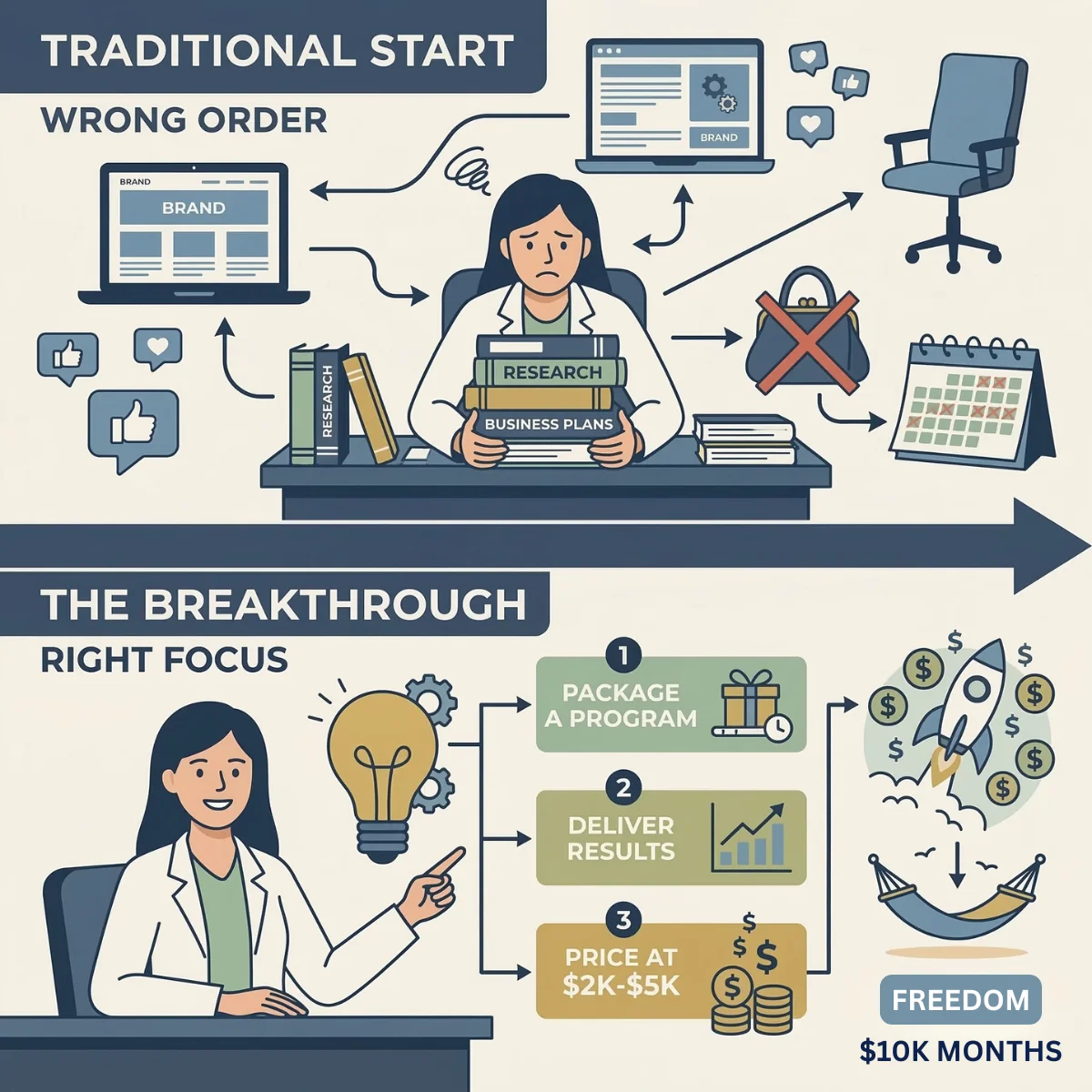 The real breakthrough happens when you stop thinking about "building a business" and start thinking about packaging your expertise into a program that delivers a specific result in a specific timeframe — and pricing it at $2,000–$5,000 instead of $80/hour.