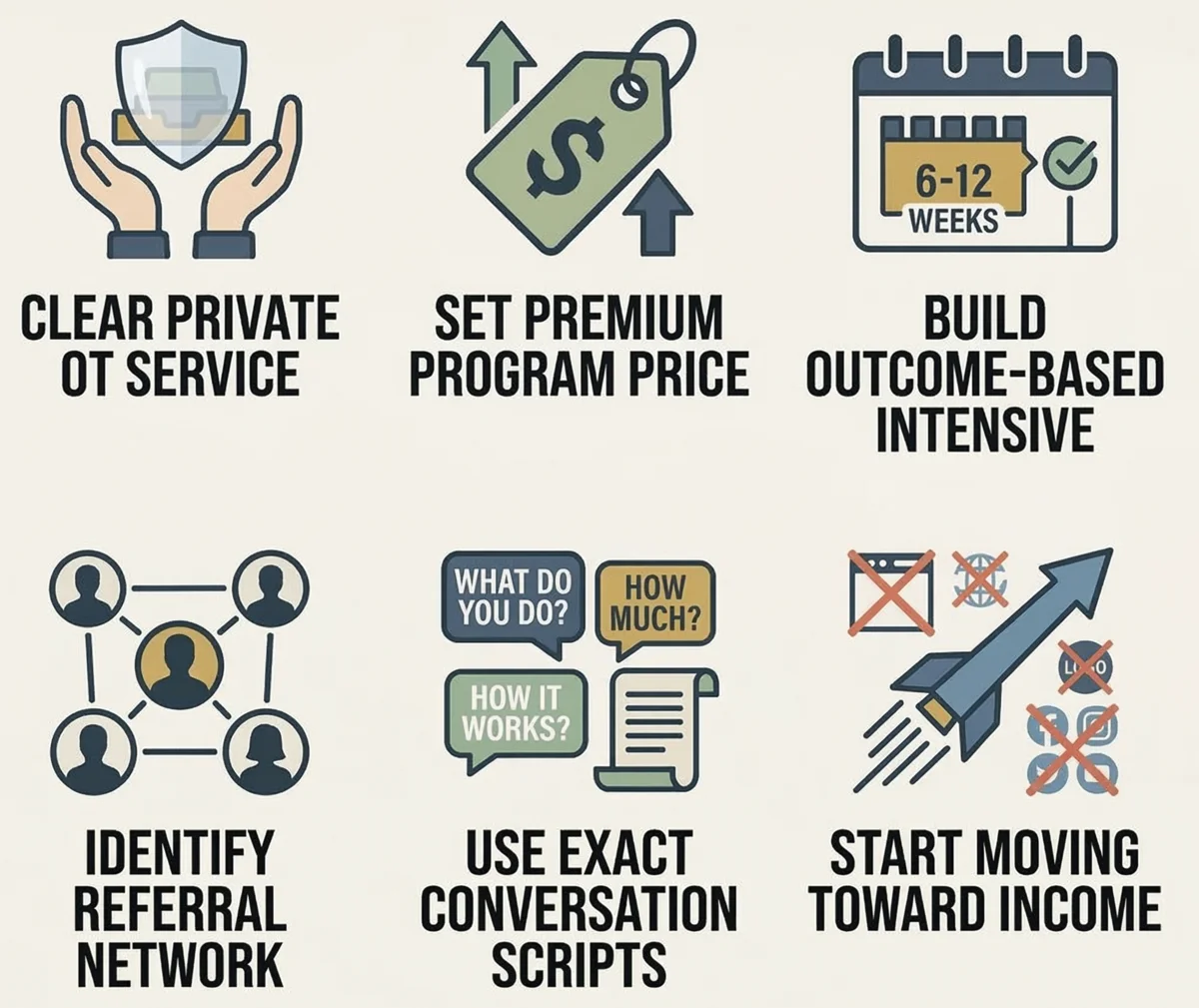 This was built using what actually works — not theory, not generic business advice, but the exact steps used to build a six-figure OT practice from scratch while working 15–20 hours a week.