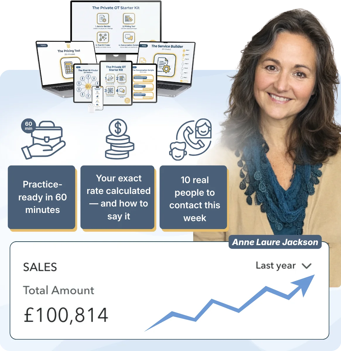 The Private OT Starter Kit was created by Anne Laure Jackson, an OT who built a six-figure private practice working 15–20 hours per week — while managing her husband's MS and visual impairment and homeschooling three boys. She started with zero business knowledge and figured it out the hard way. Her premium programs sell for $2,000–$5,000, and she's used this same system to rebuild income quickly when contracts ended unexpectedly. She teaches from real experience, not theory.